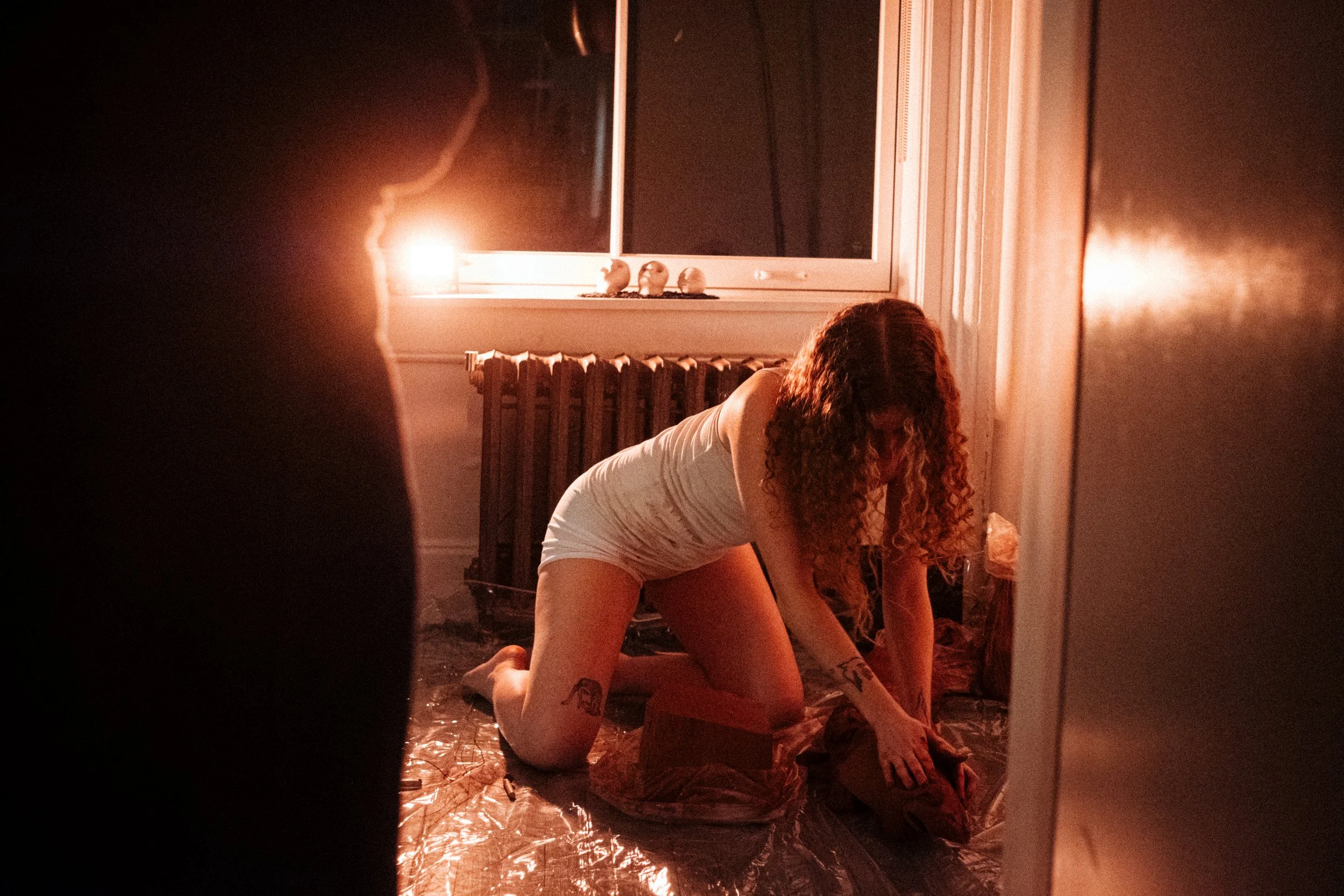 red stoneware clay, canvas, nylon, projection, performance